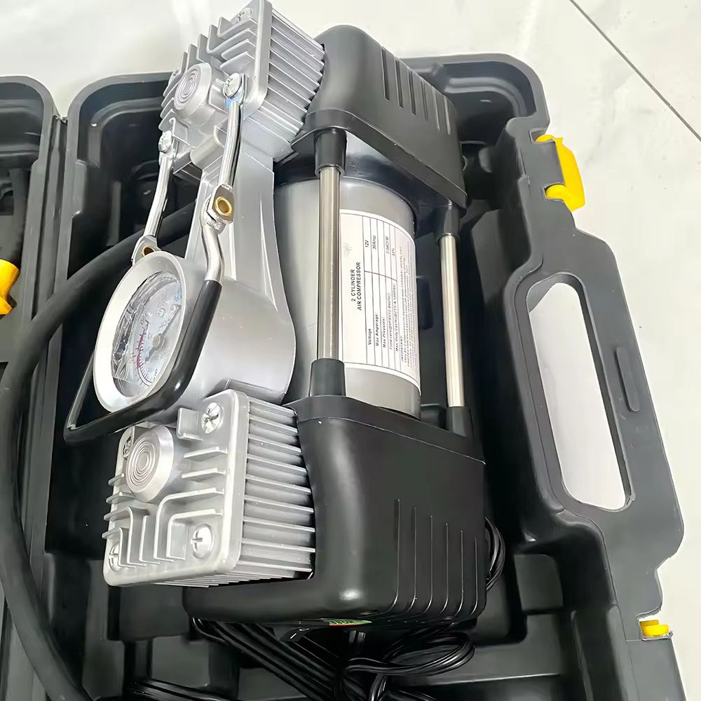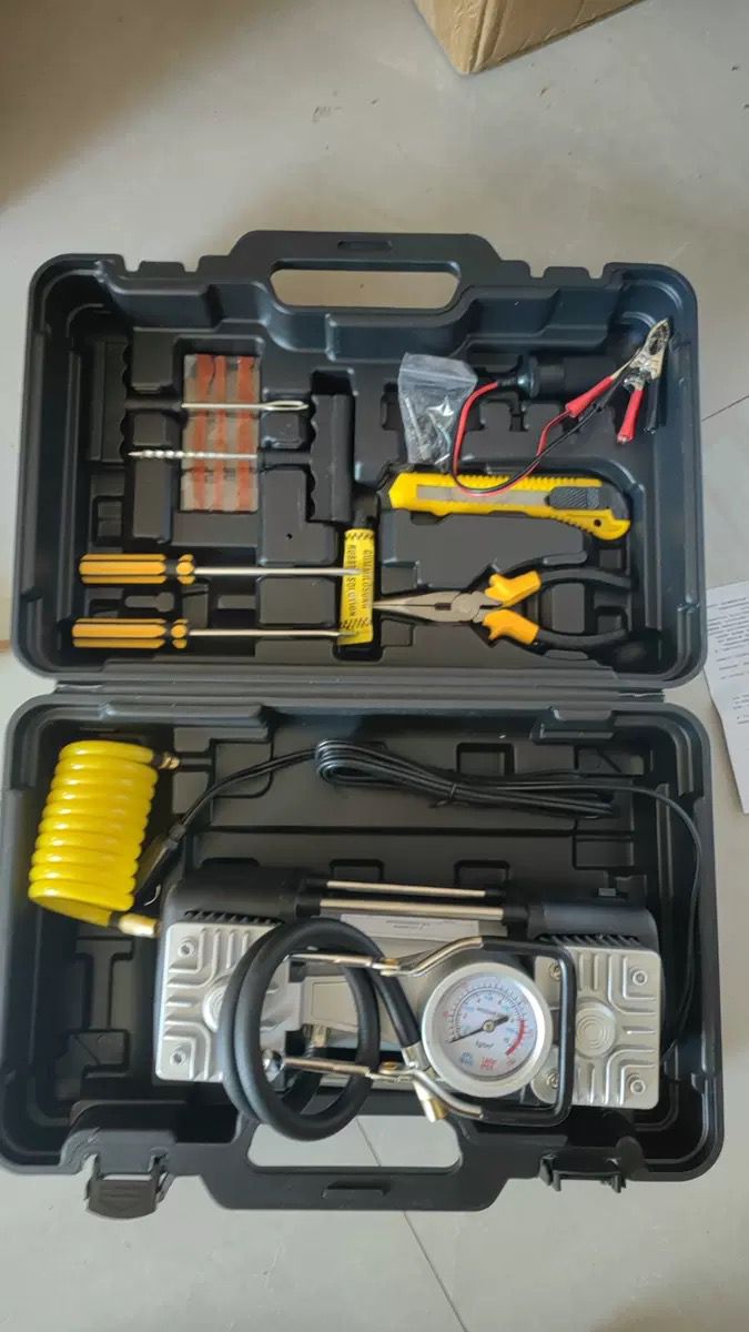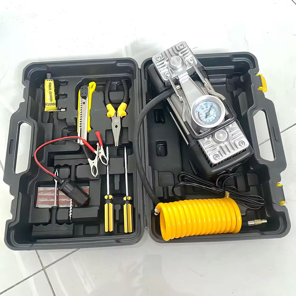 The Double Cylinder Portable Air Compressor Tool Box Kit is an essential companion for every vehicle, ensuring you are never stranded. It comes with a full tyre puncture repair kit and a high-power portable air compressor, allowing you to repair punctures and inflate tyres to your desired pressure quickly.